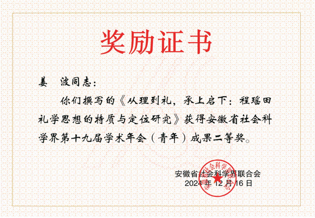 1227日至28日,由安徽省社科聯(lián)和安徽財(cái)經(jīng)大學(xué)主辦,安徽省社科界青年學(xué)者協(xié)會(huì)、安徽財(cái)經(jīng)大學(xué)社科聯(lián)和蚌埠市社科聯(lián)承辦的安徽省社科界第五屆青年學(xué)術(shù)論壇在蚌埠舉行。省社科聯(lián)和安徽財(cái)經(jīng)大學(xué)領(lǐng)導(dǎo),青年學(xué)者導(dǎo)師、青年主講嘉賓和青年學(xué)者代表等近200人現(xiàn)場(chǎng)參加論壇,論壇全程線上直播。我院青年教師姜波提交的論文獲得學(xué)術(shù)年會(huì)(青年)成果二等獎(jiǎng),并受邀作小組交流發(fā)言。