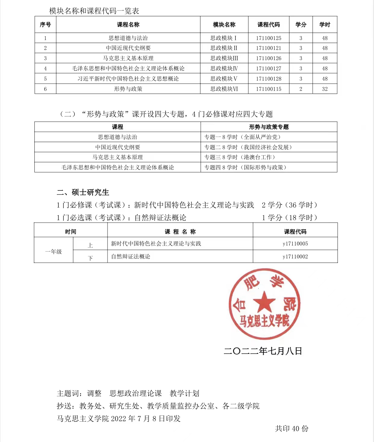 關于從 2022 年秋季學期起調整思政課教學計劃的通知(馬院〔2022〕4 號)