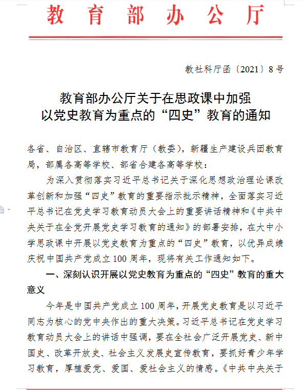 教育部辦公廳關于在思政課中加強以黨史教育為重點的“四史”教育的通知(教社科廳函〔2021〕8號)