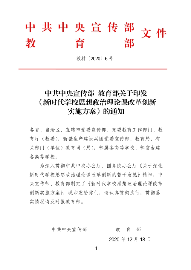 中共中央宣傳部教育部關于印發《新時代學校思想政治理論課改革創新實施方案》的通知(教材〔2020〕6號)