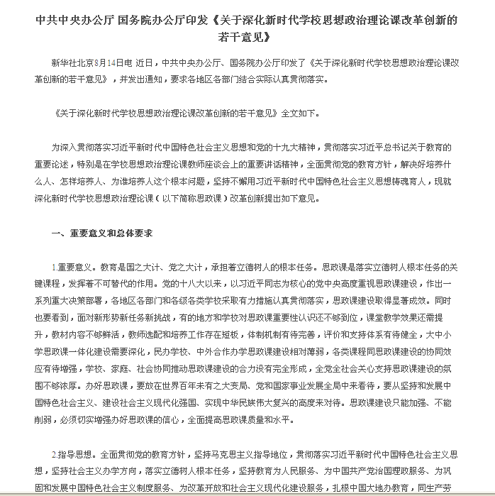 中共中央辦公廳 國務院辦公廳印發《關于深化新時代學校思想政治理論課改革創新的若干意見》(2019年8月14日)