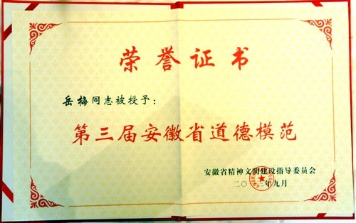 929下午,省委書記張寶順在合肥稻香樓賓館親切會見了第四屆全國道德模范及提名獎獲得者、第三屆全省道德模范。我校碩士生導(dǎo)師岳梅教授榮獲安徽省第三屆道德模范孝老愛親道德模范稱號,當(dāng)日她作為安徽省唯一獲得此項殊榮的高校教師接受表彰。岳梅教授2008年曾榮獲合肥市先進工作者稱號,2011年獲第六屆合肥市十大杰出母親稱號。