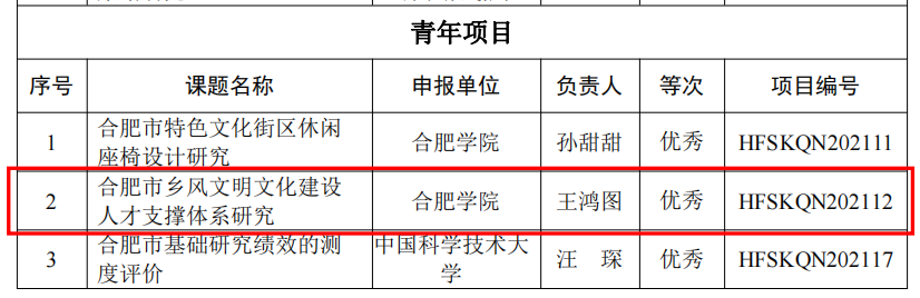 2021年度合肥市哲學社會科學規劃項目共83個一般項目正常結項。其中優秀等次項目28個,良好等次項目55個。王鴻圖的《合肥市鄉風文明文化建設人才支撐體系研究》項目順利結項,成為28個優秀等次項目之一。