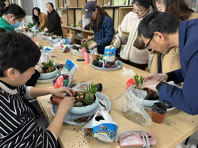 園藝老師首先詳細講解了多肉植物的種類、習性和養護要點,從光照、澆水頻率到土壤選擇,事無巨細,為大家后續的DIY環節筑牢知識基礎。隨后,在多肉盆栽DIY過程中,女教職工們充分發揮想象力與創造力。有的精心挑選不同形狀、顏色的多肉,巧妙搭配,營造出層次豐富的視覺效果;有的添加可愛的小擺件,如小蘑菇等,讓盆栽充滿童趣與溫馨。大家相互交流、分享經驗,現場歡聲笑語不斷。