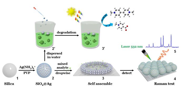 該研究工作以痕量除草劑(百草枯和敵草快)殘留為目標牽引,利用咖啡環效應,將Ag+離子還原在二氧化硅表面的直接成核制備環狀自聚集SERS傳感器,尋找最佳檢測的臨界點。該論文創新性地采用實驗和理論研究了免標記SiO2@Ag納米粒子SERS傳感器對目標分析物的SERS檢測和光催化降解,通過從太陽光中收集能量,具有高放大的增強拉曼信號輸出和對目標物種的光催化降解特性。這種簡便的策略可以為各種高危物質在化學生物、農業、食品中超痕量殘留的高選擇性識別、高敏感性檢測以及光催化降解等應用領域提供技術支撐和理論基礎。相關工作得到了國家自然科學基金和高校學科(專業)拔尖人才學術項目資助。