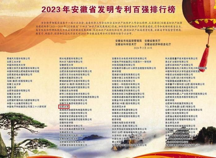 近日,省市場監(jiān)督管理局、省教育廳、省科技廳、省經(jīng)信廳聯(lián)合發(fā)布了《2023年安徽省發(fā)明專利百強排行榜》。我校繼2021年排名第37位、2022年排名第34位后,2023年升至第32位,連續(xù)九年進入安徽省發(fā)明專利百強榜。