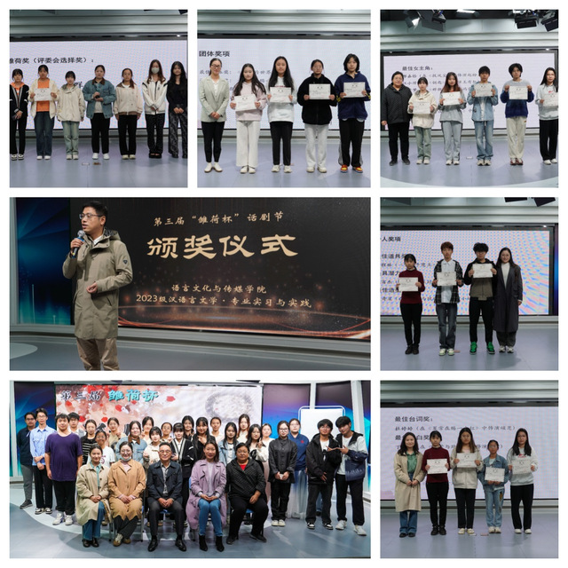 頒獎典禮于11月1日在一區(qū)演播廳舉行,文傳學(xué)院副院長殷明明出席并講話,他向話劇節(jié)的成功舉辦表達(dá)祝賀,高度評價同學(xué)們在此次話劇節(jié)中的表現(xiàn),指出此次話劇節(jié)不僅鍛煉了同學(xué)們的語言表達(dá)能力和團(tuán)隊(duì)協(xié)作能力,更拓展了專業(yè)視野,提升了專業(yè)素養(yǎng),展現(xiàn)了新時代漢語言文學(xué)專業(yè)學(xué)生風(fēng)采,并希望話劇節(jié)能成為中文系的傳統(tǒng)節(jié)目,越辦越好。