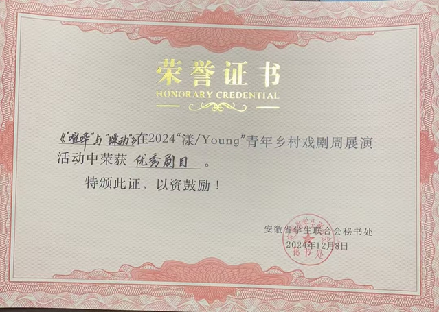 11月30日,我院22、23級漢語言文學專業學生受邀前往長豐縣馬郢村參加2024/Young青年鄉村戲劇節展演活動。此次戲劇節入選作品共有十三個,來自省內外多所高校及戲劇社團。我院參演劇目為《“喧嘩”與“躁動”》,由語言文化與傳媒學院第二屆、第三屆“雛荷杯”話劇節“雛荷獎”獲獎劇組攜手創作,此次演出獲得觀眾好評,并榮獲“優秀劇目”獎。