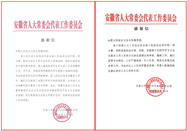 2025年1月19日至24日,我院中文系漢語言文學專業沈石麗、劉曉、宋慧婷三位同學圓滿完成安徽省第十四屆人民代表大會第三次會議的實習任務,受到省人大常委會代表工作委員會的高度肯定,并向我發來感謝信。