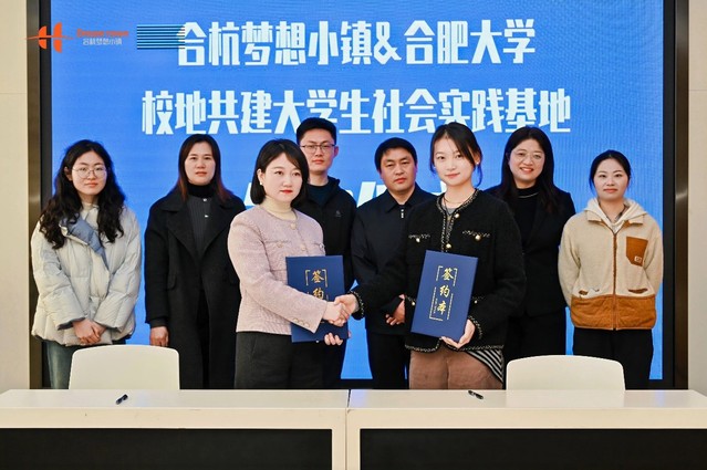 在大學生社會實踐基地簽約儀式上,合肥大學語言文化與傳媒學院團委負責人竇思佳與合杭夢想小鎮項目總經理馮小俠作為代表鄭重簽署合作協議,明確雙方在人才培養、實習實踐、科研轉化等方面的權利與義務,為長期合作筑牢根基。
