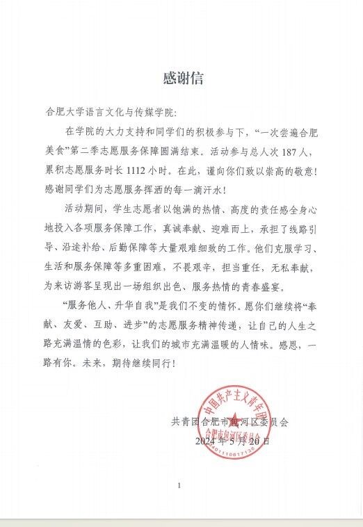 奉獻(xiàn)青春力量,鍛煉提升自我。為豐富同學(xué)們的大學(xué)生活,擴(kuò)大同學(xué)們與社會(huì)的接觸面,鍛煉和提高自己的能力,517日至19日,合肥大學(xué)語(yǔ)言文化與傳媒學(xué)院的志愿者們參加包河區(qū)磨灘旅游度假區(qū)的“一次嘗遍合肥美食”第二季活動(dòng),助力美食活動(dòng)順利開(kāi)展。