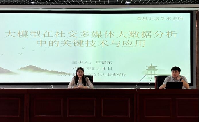 2025年6月4日上午,合肥大學語言文化與傳媒學院舉辦“善思講壇”學術講座,特邀先進制造工程學院副教授年福東博士擔任主講嘉賓,圍繞“大模型在社交多媒體大數據分析中的關鍵技術與應用”展開深入探討。本次講座由新聞與傳播專業碩士點負責人郭靜主持,2024級新聞與傳播專業全體碩士研究生參與學習。