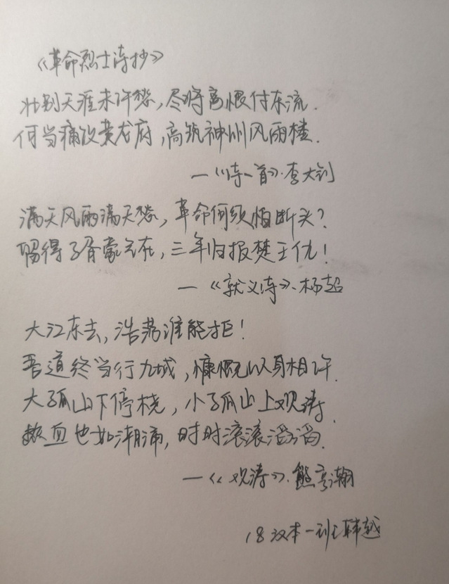 除此之外,黨員同志們還積極誦讀革命烈士詩抄,以手抄的形式表達對革命烈士的崇敬。他們紛紛表示在抄寫之時仿佛看見了無數(shù)革命烈士的錚錚傲骨,大義凜然,如是董存瑞高舉的炸藥包,如是黃繼光挺起的胸膛。通過詩歌仿佛目睹了劉胡蘭“怕死不當共產(chǎn)黨員”的豪邁,吉鴻昌“恨不抗日死,留作今日羞。國破尚如此,我何惜此頭”的慷慨,夏明翰“砍頭不要緊,只要主義真,殺了夏明翰,還有后來人”的激昂,更有千千萬萬個無名戰(zhàn)士“寧為戰(zhàn)死鬼,不做亡國奴”的凜然正氣。