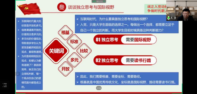 課程伊始,朱濤老師首先為同學(xué)們簡(jiǎn)單介紹了中國(guó)共產(chǎn)黨的特點(diǎn)與基本知識(shí)點(diǎn),使同學(xué)們對(duì)中國(guó)共產(chǎn)黨形成一個(gè)更加清晰的認(rèn)知與了解。其次,朱老師帶領(lǐng)同學(xué)們回顧了有關(guān)科學(xué)發(fā)展觀的內(nèi)容及科學(xué)發(fā)展觀對(duì)人們?nèi)粘I畹默F(xiàn)實(shí)意義。接著,朱濤老師為同學(xué)們講列舉了一些同學(xué)對(duì)于其入黨動(dòng)機(jī)這個(gè)問題的回答。他在對(duì)這些回答做出分析評(píng)價(jià)的同時(shí),也向同學(xué)們提出了一些具體的建議及要求。而后,朱老師就獨(dú)立思考與國(guó)際視野的話題與同學(xué)們分享了自己的看法。他指出,在當(dāng)今這個(gè)網(wǎng)絡(luò)與信息高度發(fā)達(dá)的時(shí)代,我們每個(gè)人都要具備獨(dú)立思考的能力與國(guó)際視野,要學(xué)會(huì)在多元化的價(jià)值觀念中獨(dú)立思考,堅(jiān)定自己的立場(chǎng)與判斷,堅(jiān)持以中國(guó)優(yōu)秀傳統(tǒng)文化為根基,以國(guó)際視野為坐標(biāo),以讀書行路為路徑。最后,朱濤老師為同學(xué)們提供了一些相關(guān)書籍,使同學(xué)們能夠更好地做到獨(dú)立思考、知行合一。