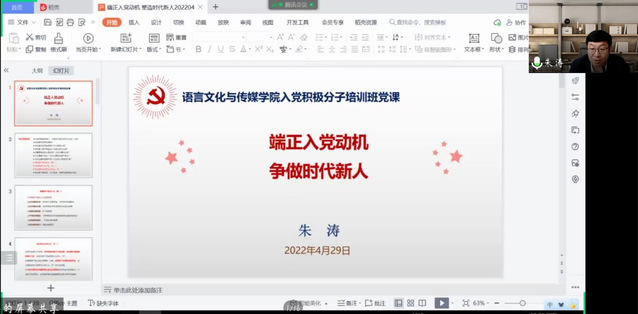 4月29日中午12:15語言文化與傳媒學(xué)院入黨積極分子培訓(xùn)班第課線上授課順利開展。本次課程由合肥學(xué)院黨委委員學(xué)工部部長(zhǎng)學(xué)生處處長(zhǎng)朱濤主講,文傳學(xué)院入黨積極分子培訓(xùn)班全體學(xué)員參加。