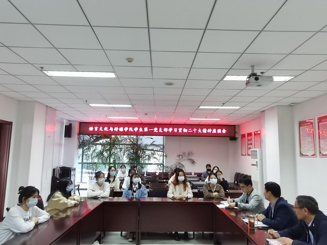 11月1日下午,校黨委委員、黨委學工部部長、黨委武裝部部長、學生處處長朱濤到聯系支部語言文化與傳媒學院學生第一黨支部宣講黨的二十大精神。語言文化與傳媒學院黨委書記儲昭輝、黨委委員、副院長殷明明陪同參加,宣講活動由支部書記劉政主持,支部全體黨員參加。