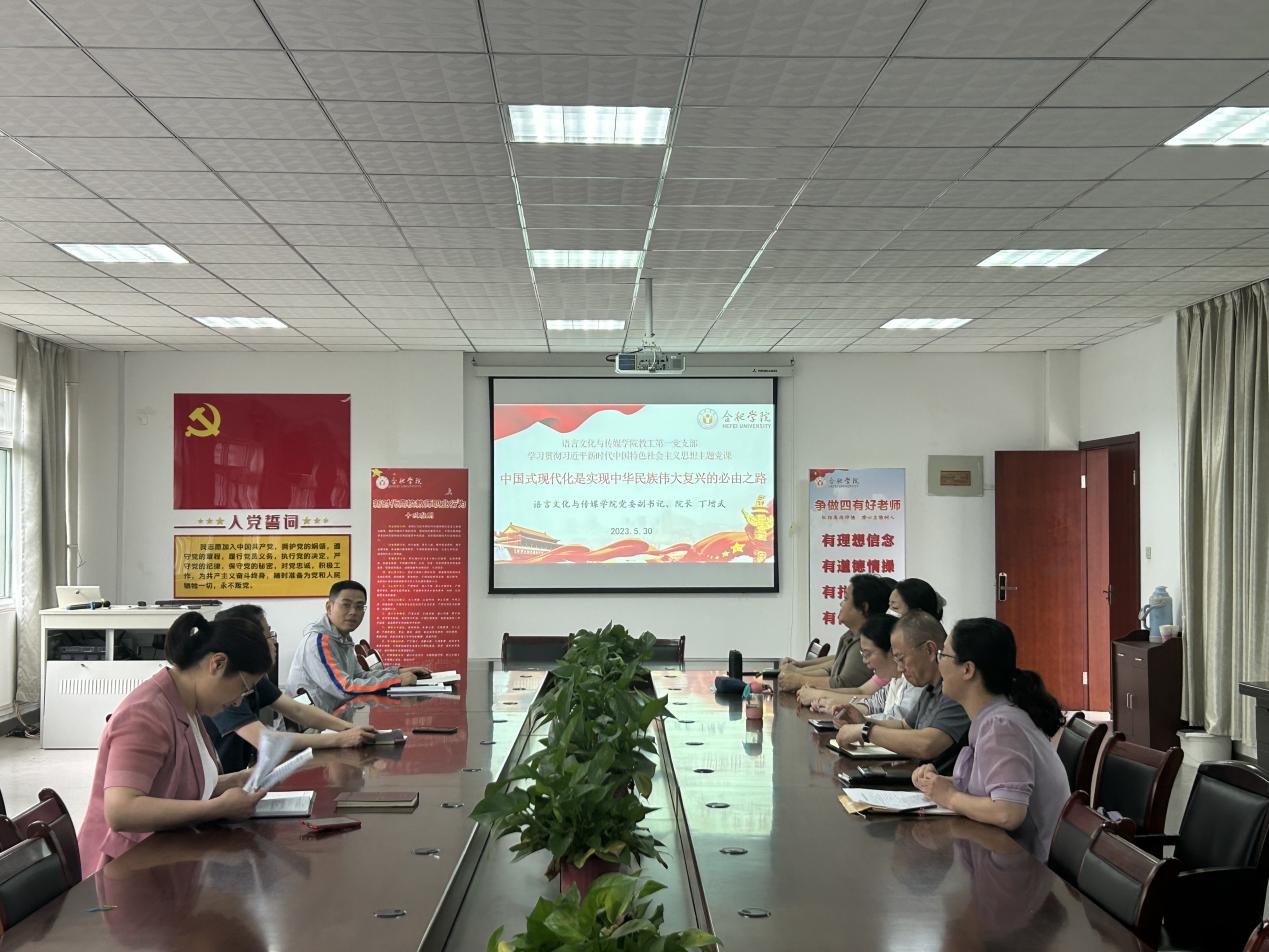 為深入學習貫徹習近平新時代中國特色社會主義思想,5月30日下午,語言文化與傳媒學院黨委副書記、院長丁增武到教工第一支部為全體黨員講授主題教育專題黨課,黨課主題為《中國式現代化是實現中華民族偉大復興的必由之路》。