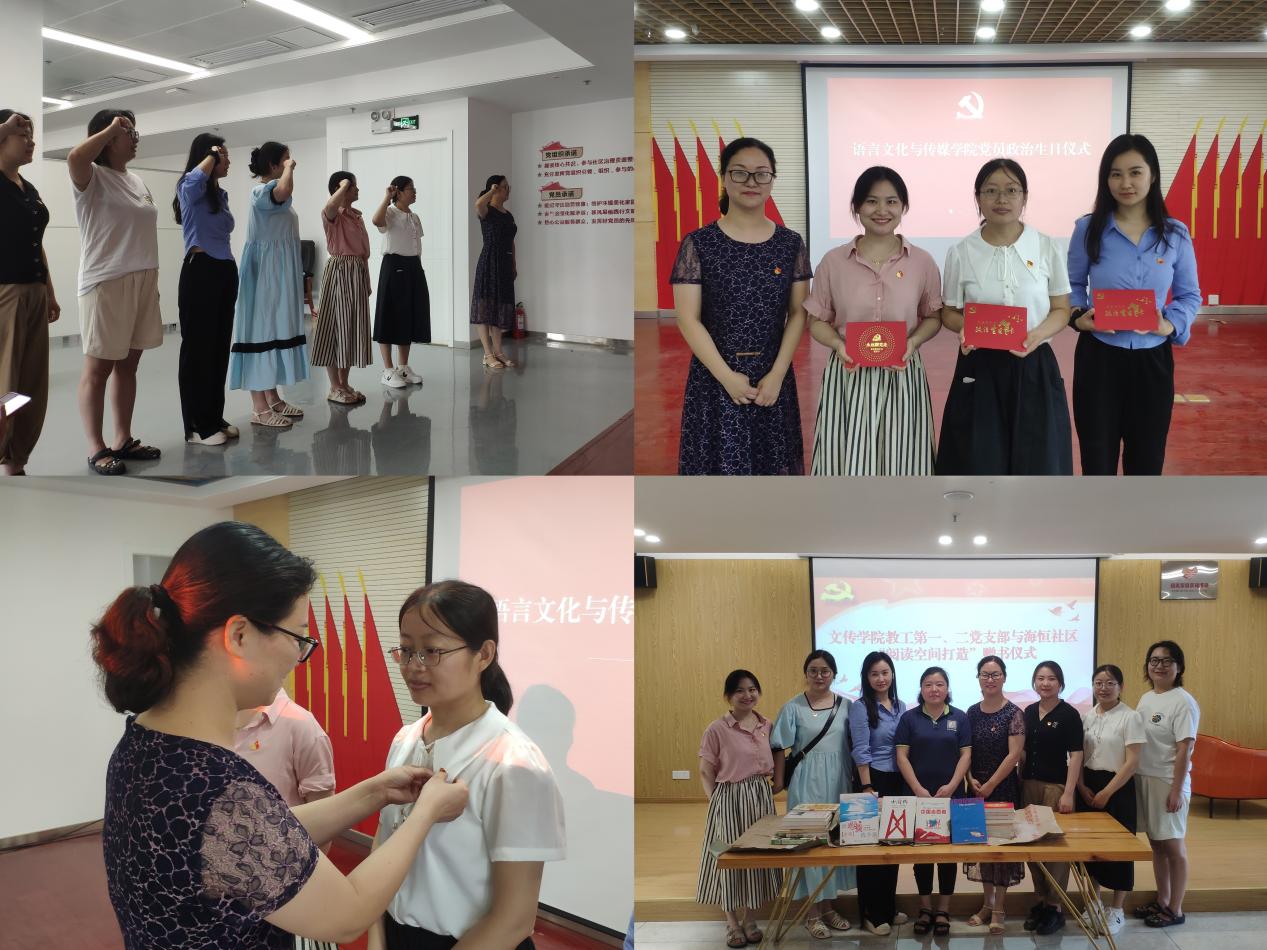 為慶祝中國共產黨成立102周年,增強黨性教育,7月4日下午,語言文化與傳媒學院教工第一、二黨支部前往海恒社區進行主題黨日活動。此次活動有兩項議程:一是在海恒社區進行閱讀推廣活動,二是為支部黨員過政治生日、重溫入黨誓詞。