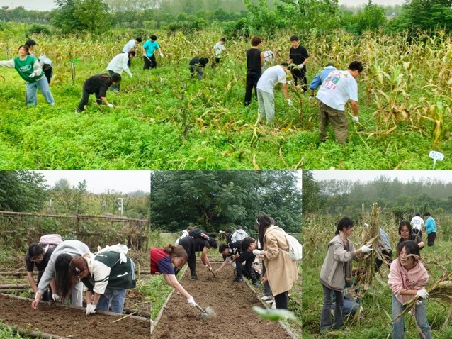 活動伊始,學生在基地工作人員的引導下參觀了生態農場。工作人員介紹了大棚實時感應檢測、風吸式殺蟲燈、智能降溫設施等現代化設備,豐富了學生對現代農業科技應用以及馬郢數字農業產業的認知。隨后在工作人員的帶領下,學生分起了小組,并拿起白手套和鐵鍬積極投入農業勞作,清理雜草、平整土地、點播蔬菜老種子、收割玉米秸稈等,與泥土近距離接觸,躬身體驗了農業日常,實地上了一次勞動實踐課,現場氣氛熱烈。