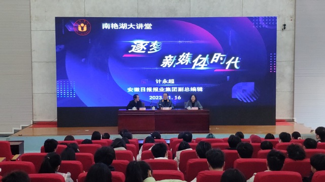 1116日下午三點,由合肥學院科研處、語言文化與傳媒學院主辦的南艷湖大講堂學術報告在圖書館報告廳B廳順利舉行。本次活動邀請了安徽日報報業集團副總編輯計永超做題為“逐夢新媒體時代”的學術講座。講座由語言文化與傳媒學院院長丁增武教授主持,合肥學院校長吳春梅教授致歡迎辭。語言文化與傳媒學院黨委書記儲昭輝,副書記張愛萍,副院長殷明明、查金萍以及150余位新聞傳播學專業師生共同參與此次講座。