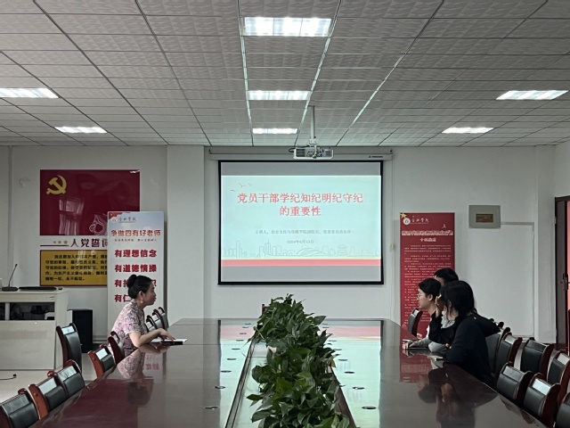 2024613日下午,合肥大學語言文化與傳媒學院研究生黨支部在學院大會議室開展以“黨員干部學紀知紀明紀守紀的重要性”為主題的黨紀學習教育專題黨課。黨課由語言文化與傳媒學院副院長查金萍教授主講,研究生黨支部全體黨員參加。